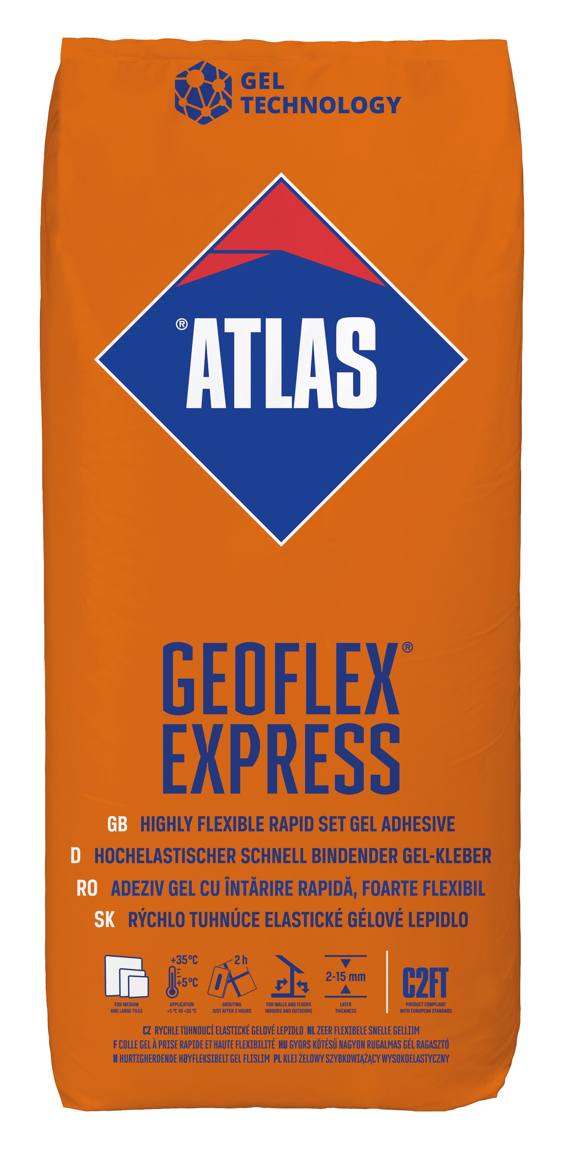 - Der Kleber ATLAS GEOFLEX EXPRESS basiert auf einer innovativen Silikat Gel Technologie in Verbindung mit schnellabbindendem Zement. Er gewährleistet: